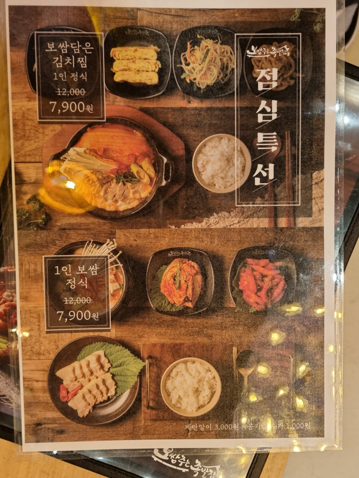 메뉴판입니다. 제가 먹은메뉴는 점심특선 보쌈담은 김치찜과 1인보쌈정식 7,900원입니다.